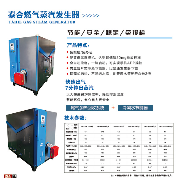 产品简短介绍:泰合燃气蒸汽发生器是我公司结合同行业各种产品的使用优点,改进其弊端,自主研发了符合环保节能政策要求,无烟无尘效率高比传统锅炉节省燃料;免办证无需年检的产品。